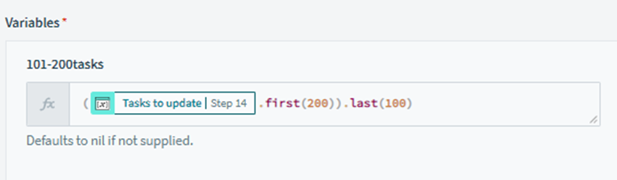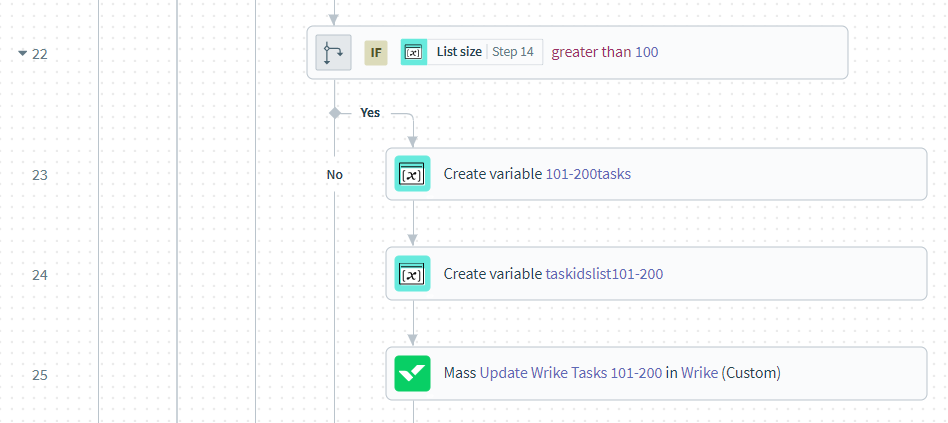 Step 15 – Gets the first 100 items from the list. This needs to be done as custom actions in Wrike can only update a maximum of 100 tasks at a time. Batches of 100.