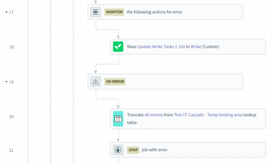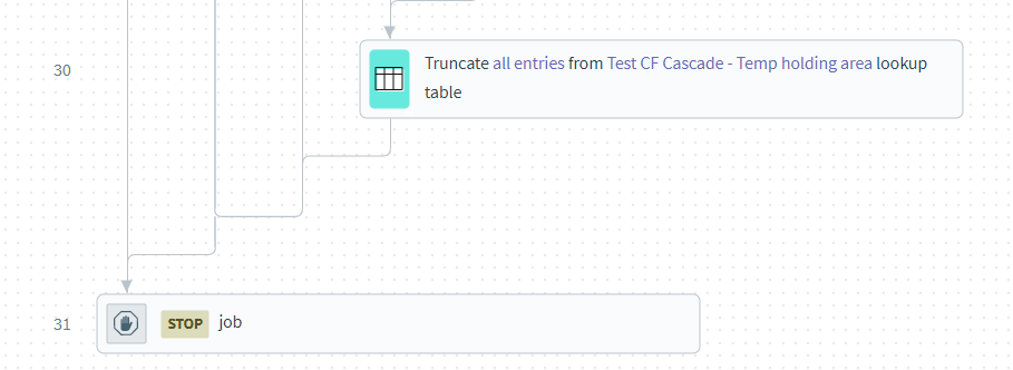 Step 17 - Monitors if there is an error and if there is Step 20 will clear the lookup table ready for the next job and step 21 will stop the job