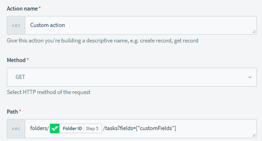 Step 7 – Custom Action to get all the tasks in the folder (or project) identified and their Custom field values.