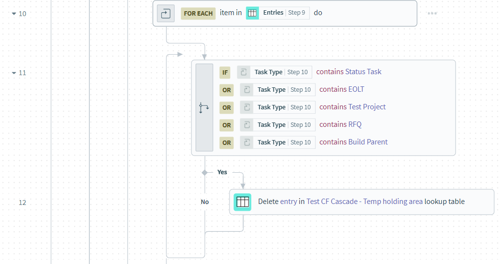Steps 9 -12 - Retrieves all the entries from the look up table and removes any which have a task type which we do not want to cascade custom field values too. We have certain tasks tagged into projects where we do not want to overwrite the custom field values.