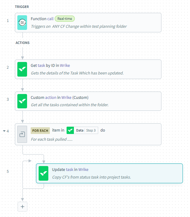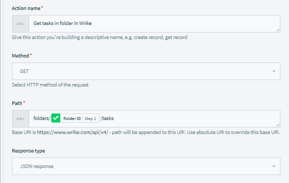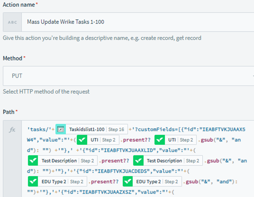 Steps 17 -21 – Using the variable from step 16 custom action to post changes to Wrike. The syntax used in the snip bellow is: