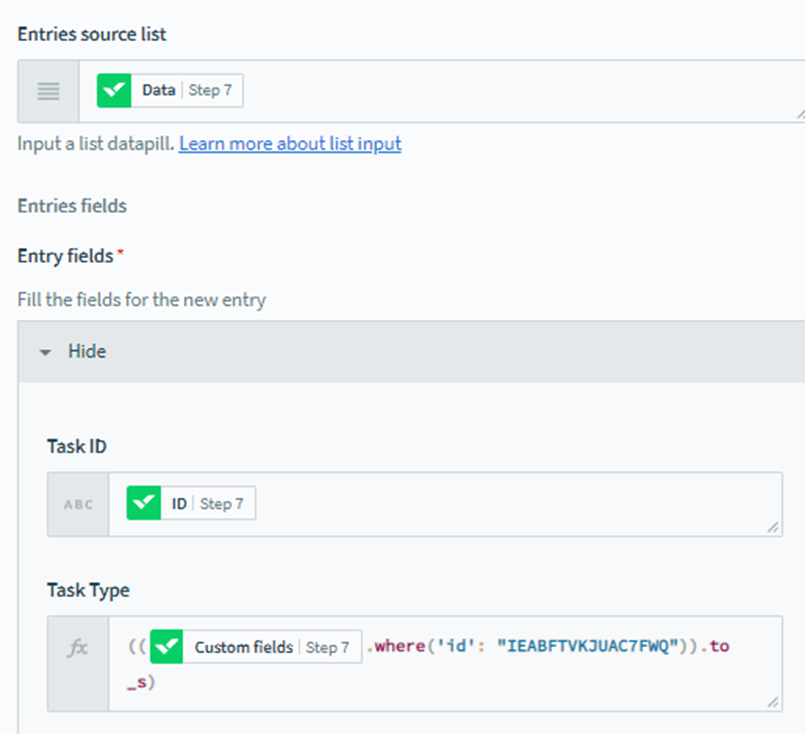 Step 5 - Update each task in the loop with selected custom field values mapped from the task data pulled in step to each of the tasks collected in step 3 via the loop.