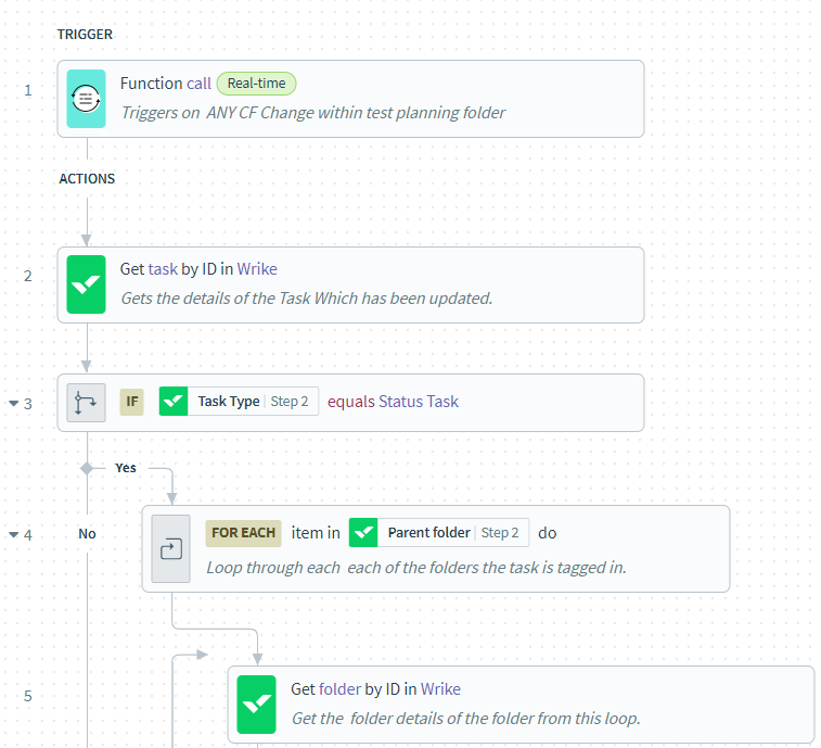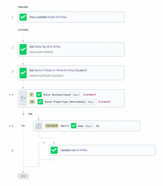 The main issue with this is that it is very slow / falls over at scale due to lack of batch processing in Workato. i.e. you have to get each task and update one at a time rather than in batch's of say 100. This makes it slow when updating a project with 100's of subtasks and uses a lot of Workato jobs (1 to grab each task, 1 to update each task and a few extra ones for checks I have in our full version of the flow), still beats doing it manually though!