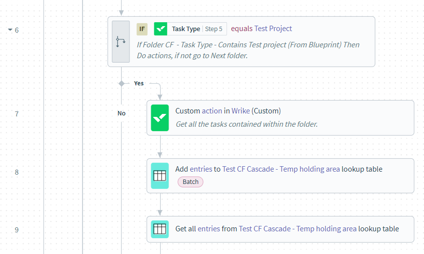 Step 6 – Checks the folder we just grabbed to see if it is the one, we wish to cascade the custom fields in. Again, we are using the Custom Field Task type to identify which this is. This prevents the cascade happening on another folder which the task is cross tagged to that we may not want to cascade in.
