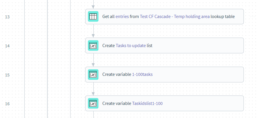 Step 14 – Creates a list of all the tasks to be cascaded to from the lookup table.