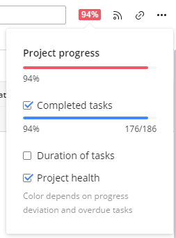@Marj, so based on your selection, you have 176 out of 186 tasks completed which gives you a 94% of completion of this project. You can also choose different criteria, such as โDuration of taskโ so you might get a different % of project progress.