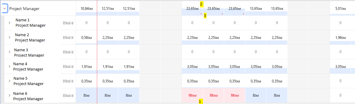 At (1) you can see an overbooking of my Project Manager 6. This is also indicated by the red dot (3) in the job role line. I even see, that I should have plenty of project managers to jump in and solve the conflict (3).