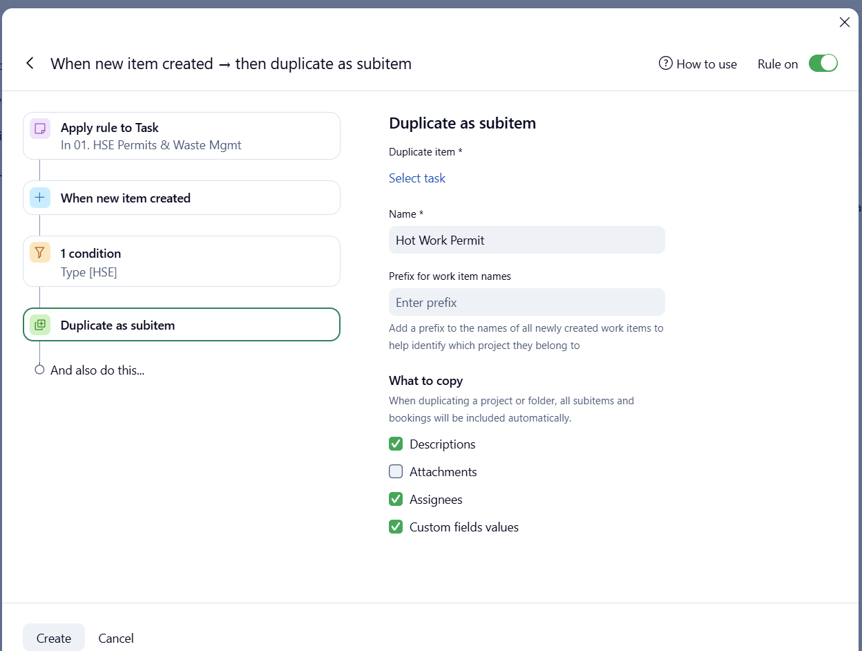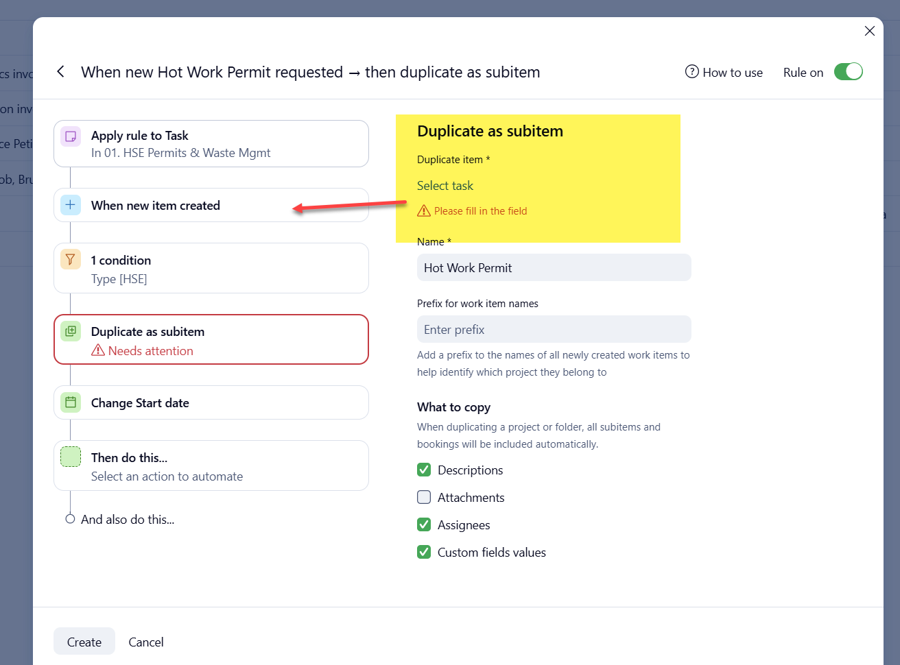Our Health, Safety & Environment (HSE) team receives a request for works requiring a special work permit. The task created by our form denotes the works to be done. But then our HSE team (as per French regulations) has to create a work permit every day for that job (for example, a permit for Hot Works, Confined Spaces, etc). So ideally when someone selects "Work Permit - Hot Works" as a request in the HSE form, I would like to Add Action --> Add Subtask and then make some choices regarding that subtask such as as: