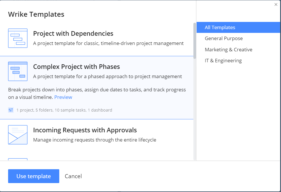 There are Onboarding templates that you can use in your account, and one of them is Complex Project with Phases. The templates are available to all paid accounts. Please check out this Help Center page for more info: https://help.wrike.com/hc/en-us/articles/360003549734-Onboarding-Templates