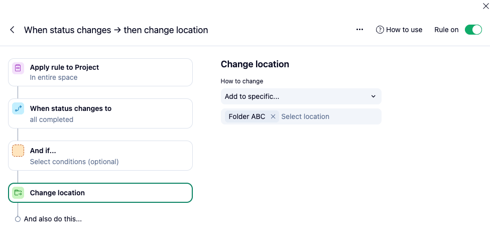 When task 1.1. changes the status to complete. Project 1 should be added to Folder B.1 (Folder B.1 is in space B) . So at this point Project 1 will be located in Space A and Space B (inside Folder B.1)