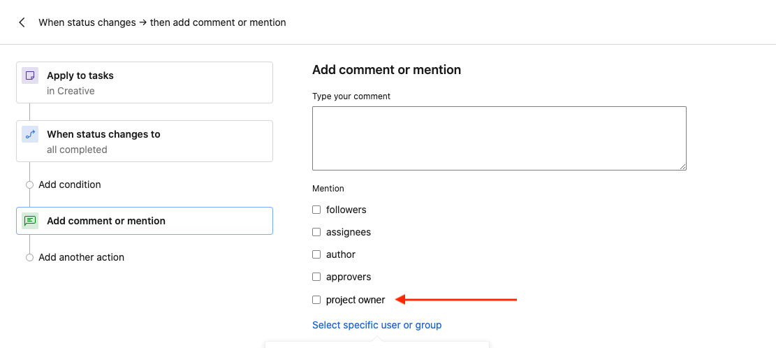 Note: Just like any other automation rule, this rule can be applied to tasks and projects. Also, it will only trigger for active tasks and projects.ย