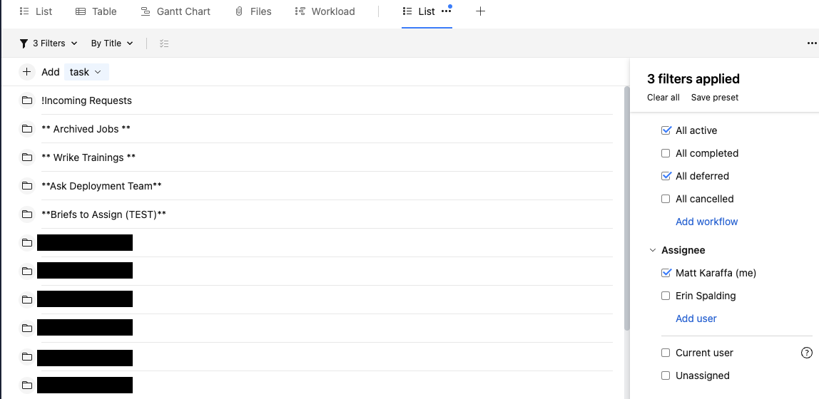 What would be the most effective way to create or filter down a view for all active & deferred tasks of an individual team member? I don't see the advanced filtering from the Space level yielding a list of tasks, just folders. I cannot see another person's To-Do list. Creating a dashboard of their assigned tasks could work, but I wouldn't have the bulk edit functionality from that view/module. Any suggestions?