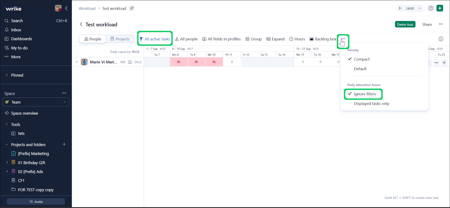 - La causa más común de que aparezca esfuerzo inesperado en tus gráficos de carga de trabajo es que haya un filtro aplicado mientras la opción \"Ignorar filtro\" está seleccionada en el ajuste de asignación diaria en el menú de tres puntos del gráfico. Esto significa que, aunque el gráfico muestra solo las tareas filtradas, suma el esfuerzo de todas las tareas sin importar los filtros. Esta opción es útil cuando no quieres ver las tareas filtradas, pero sí mantener una vista general de toda la carga de trabajo.