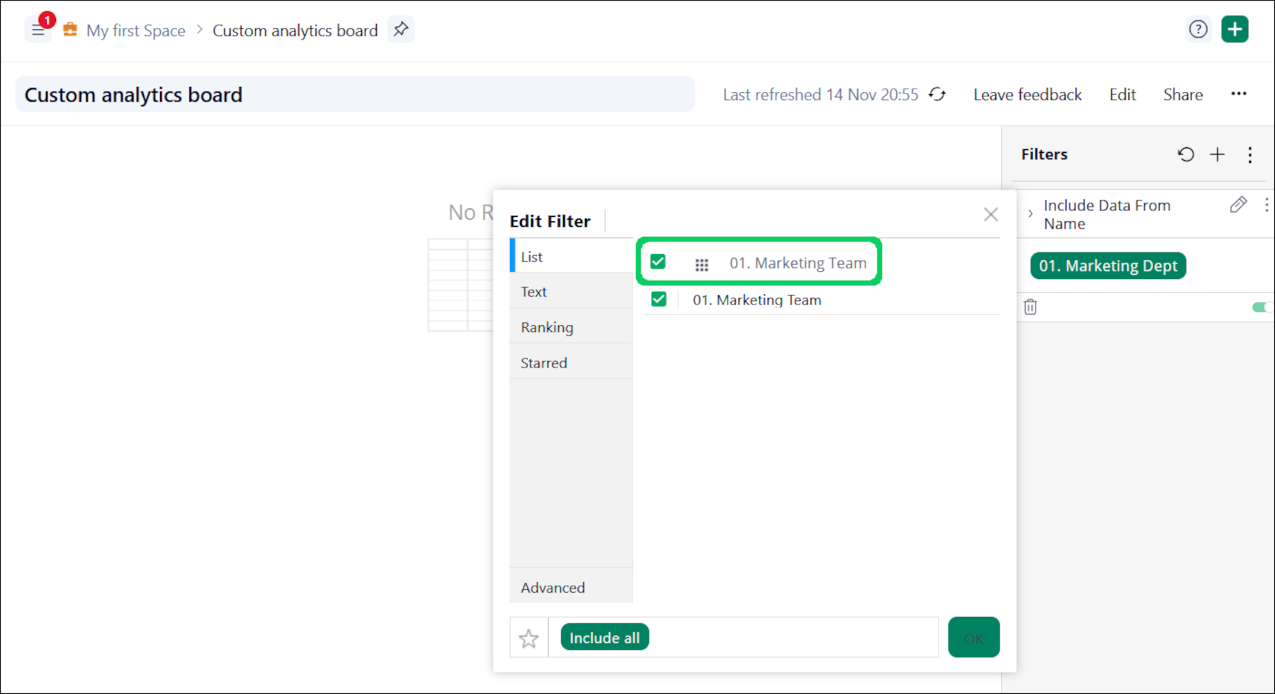 - Vuelve a añadir la dimensión correcta desde la tabla de datos adecuada (p. ej., Campo personalizado de tarea) al informe.