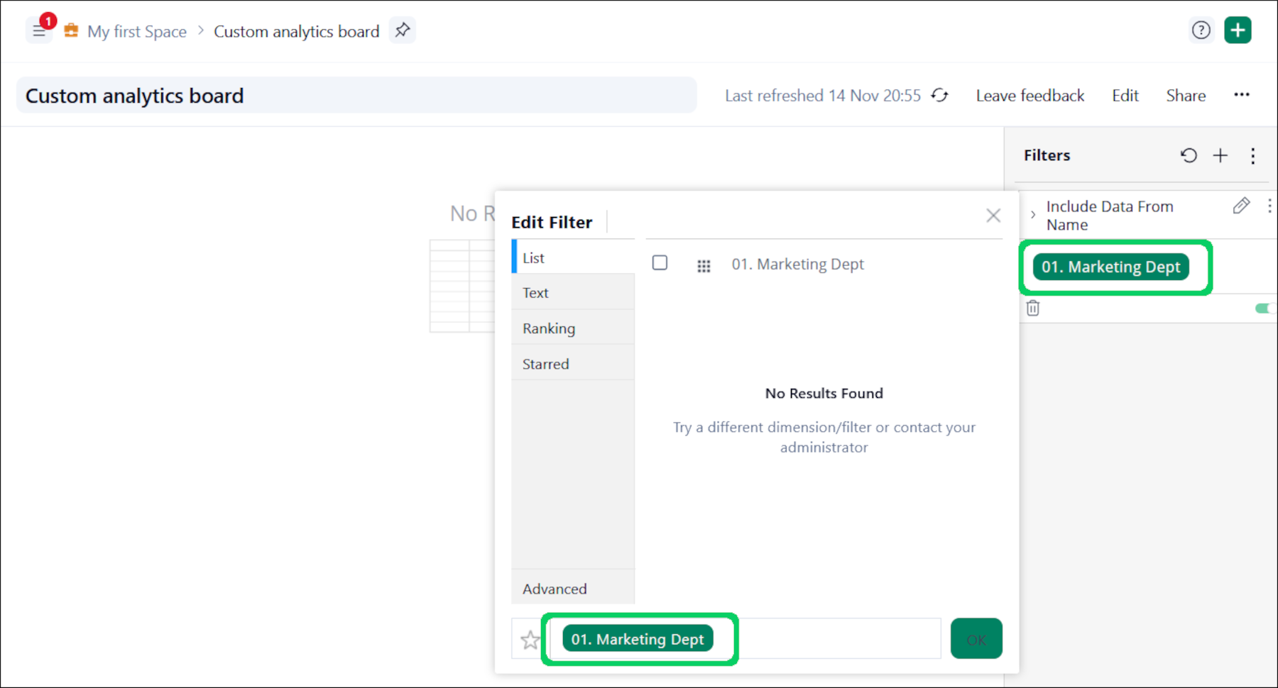 - Nelle impostazioni del widget, disattiva ciascun filtro uno per volta per verificare se compaiono dati. Inizia con i filtri della dashboard.