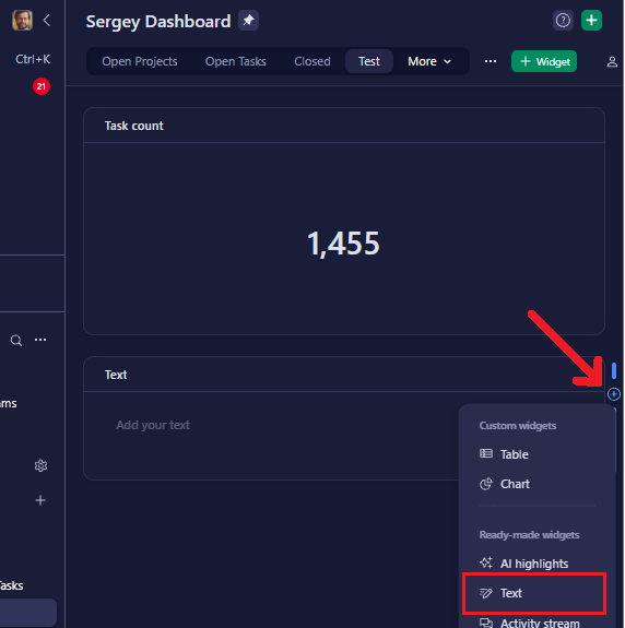 1. Create a new section in a dashboard, let's call it "Test".