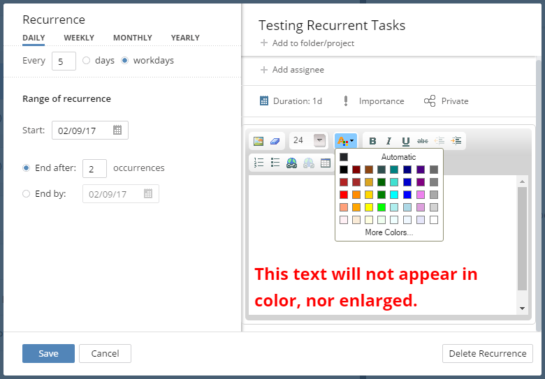 "Largely nonfunctional" indeed seems the best way to describe the recurrent tasks editor. Are these formatting controls actually supposed to do something?
