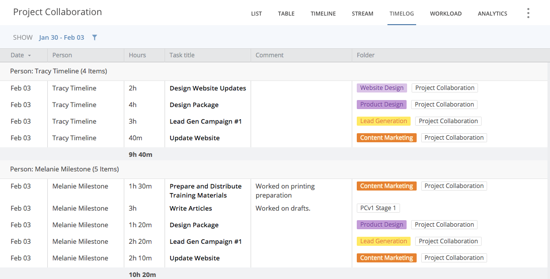 Hi Suzanne! It sounds like the Timelog View might be helpful for you, it shows your a breakdown of time tracked by person/task. To switch to the Timelog View: