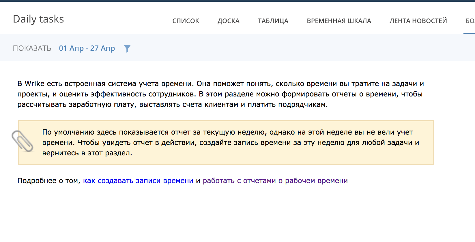 Hi Anton, great to hear from you again! This does seem odd, since the filtering criteria is correct. Something to double check would be whether the task belongs to the Folder you're looking at in the Timelog. Could you please let me know if the task is in the current Folder? If that isn't the case, we can open a Support ticket to investigate this further (and let me know if you'd like to switch to email to continue in Russian too). Looking forward to your reply!