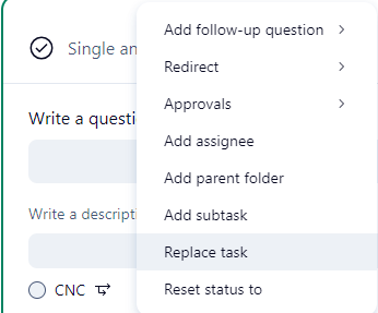 I'm setting up a new request form for the first time in a while and, am I crazy, or has the 'replace task' option disappeared from the 'further actions' options in the multiple answers question?