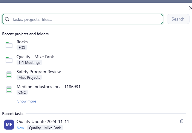 Search only gives the option to search in "recent" or, when I enter search text, it only shows tasks, projects, comments and files. No place to select a space.