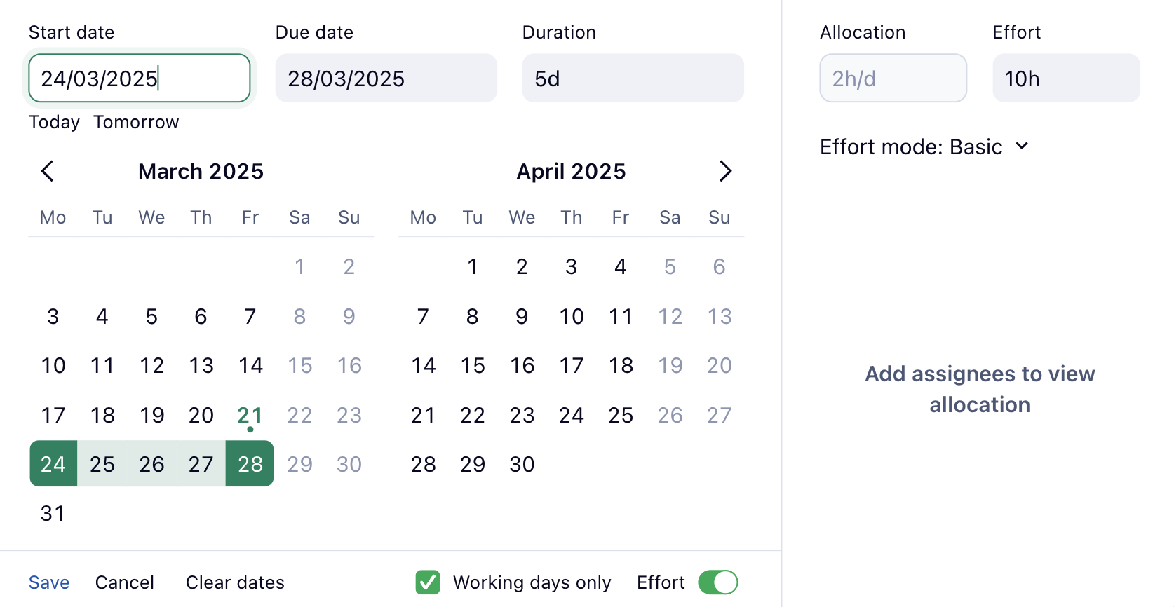 For example, here I can only select one date (4/11), so I have to keep the start date column for the task to reflect the actual duration of the task. This is important to our organization because we rely on the Workload charts and need to be able to see the start and due dates of tasks in that view.ย ย