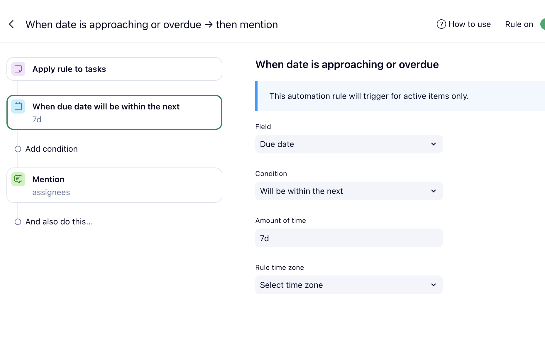 • When due date (field) will be within the next (condition) 1 week (amount of time)