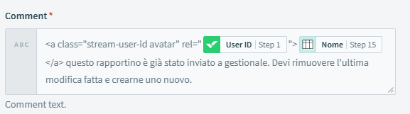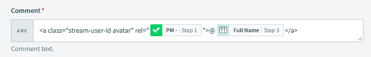 I am working on an integration recipe in Workato through which I want to add a comment and mentioning specific user when the task status changes. My problem is that don't know how to write a comment in Workato that triggers @NAME in Wrike comment. I have already tried the formatting below:
