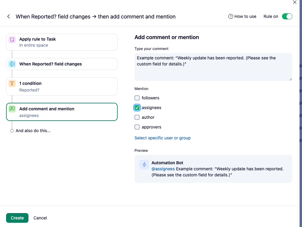 - Then, automation logic should trigger - add a comment to each task with the content of 'Weekly update' field, and removing values of both custom fields.