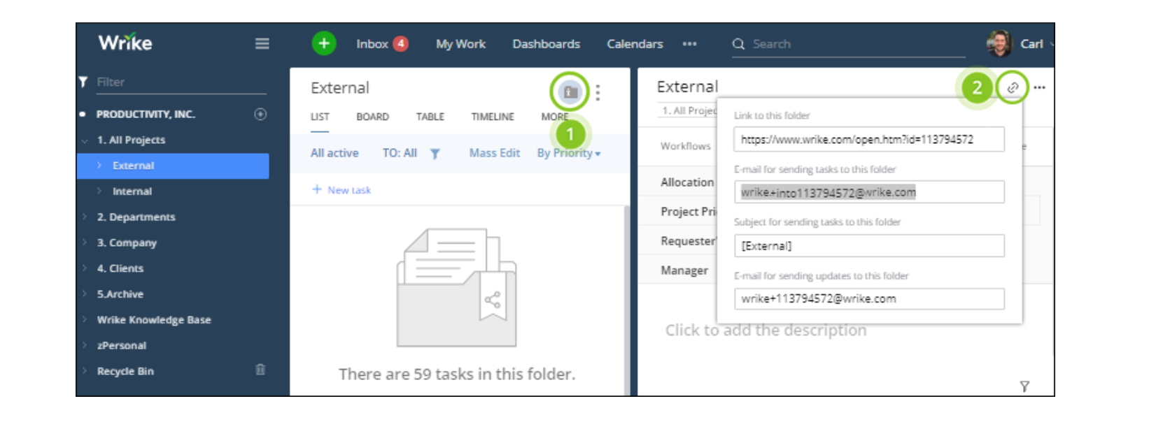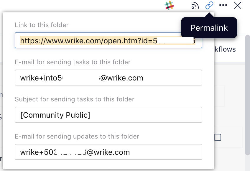Does Wrike still have this option? To send an email to a folder? Because I can find a folder's permalink but cannot find an email. We want to use this to create support "tickets" for our web developer who just moved over from the IT team to the Marketing team. IT uses Freshworks. Marketing uses Wrike. So we need to move the process over, but keep it as simple as possible for users who are used to sending a simple email to a help desk.
