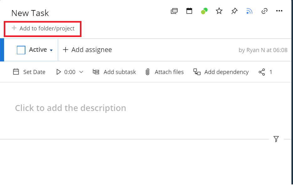 If you want to add a task to a Folder, you can open the Folder in your Folder tree on the right hand side. You'll then see add task below it. See the Gif below.