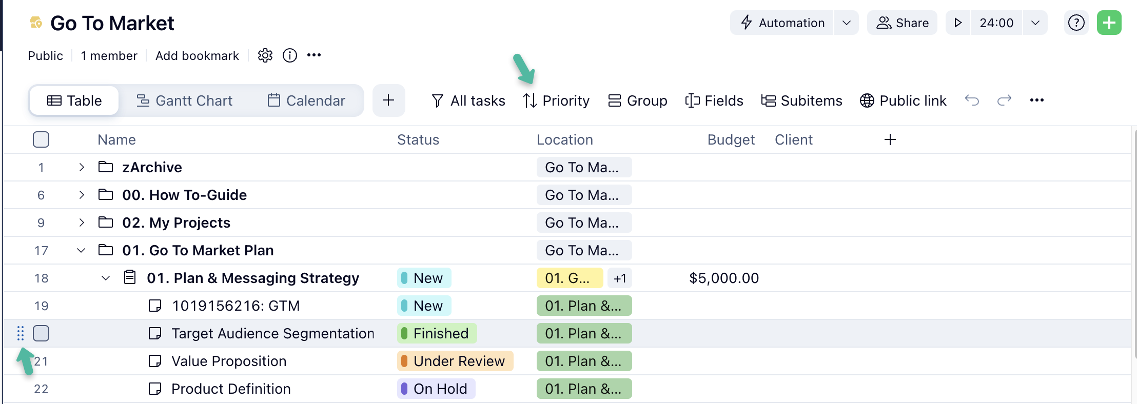 Hi - how do you move a task up and down on the table view? I can do it on the list view and gantt chart but not the table view.