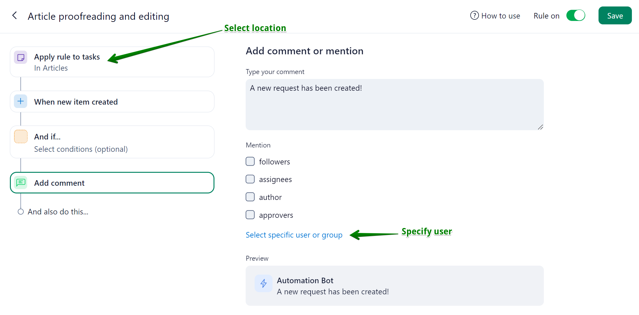 Hi Nicole S, thank you for sharing your use case with us. You could create an automation rule to @mention the relevant user when a task/project is created in a specific location (which should be the location where the item would be created upon request submission):