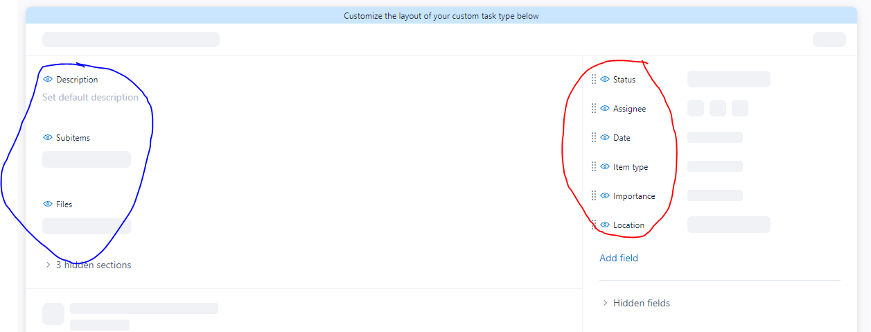 3. Is there a reason why you can re-order the appearance of the fields (circled in red) on the right column of a custom item, but you can't reorder the sections on the left side (circled in blue)?
