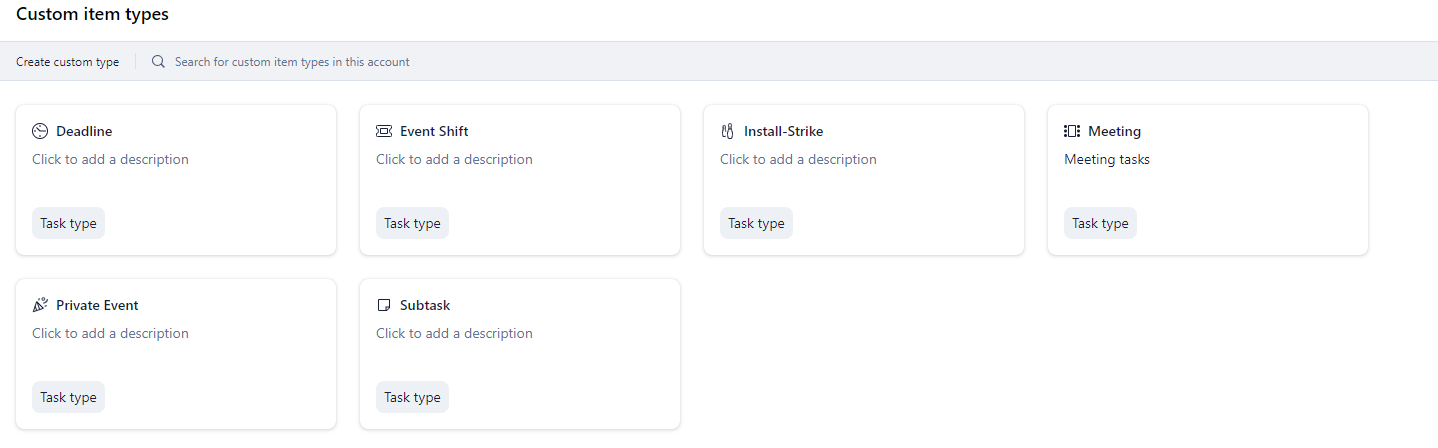 It would also be helpful to have a duplicate option for custom item types. While they are custom, sometimes one is similar to another so being able to duplicate and update from there would be a helpful timesaver. A duplication function would also ensure consistency if types are related.