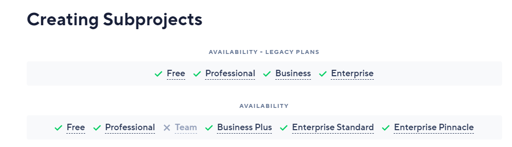 While the new Team plan indeed has a ton more functionality compared to the Free plan, subprojects are not available as you mention in your post. I've flagged that internally as well.