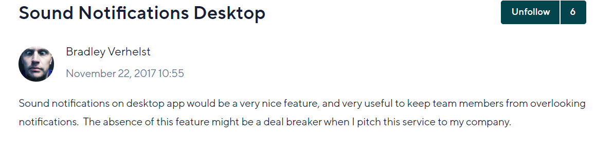 Sound notifications on desktop app would be a very nice feature, and very useful to keep team members from overlooking notifications. The absence of this feature might be a deal breaker when I pitch this service to my company.