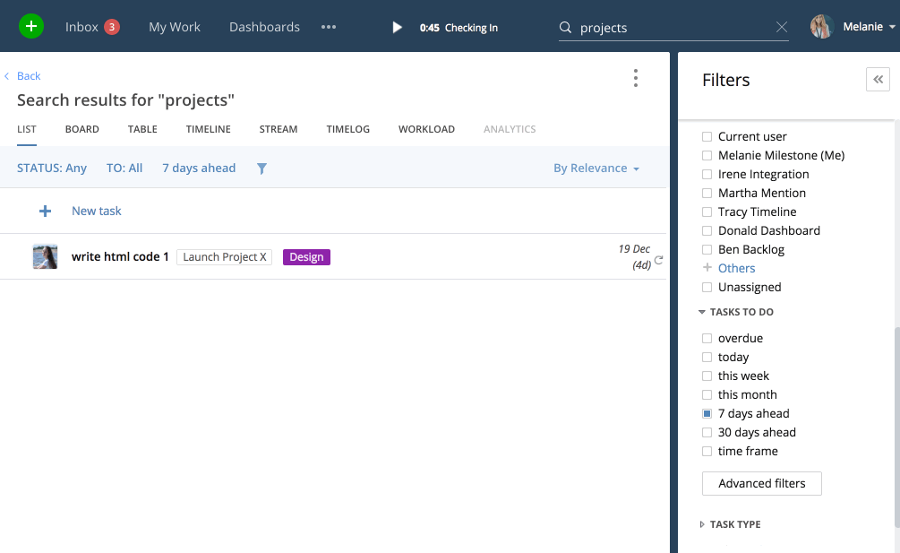 If you plan on using this particular Search, you can click the menu button, after you've searched, and add these conditions as a widget to a Dashboard so you'll be able to quickly reference tasks to do 7 days ahead at any time.