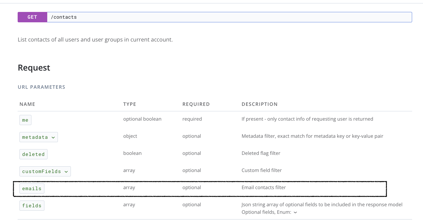 hey shaedrich & Sai Sudheer Narkidimilli, we have an update for you on this topic - we recently added ability to filter GET /contacts endpoint via email addresses. Please give it a try. Thanks.