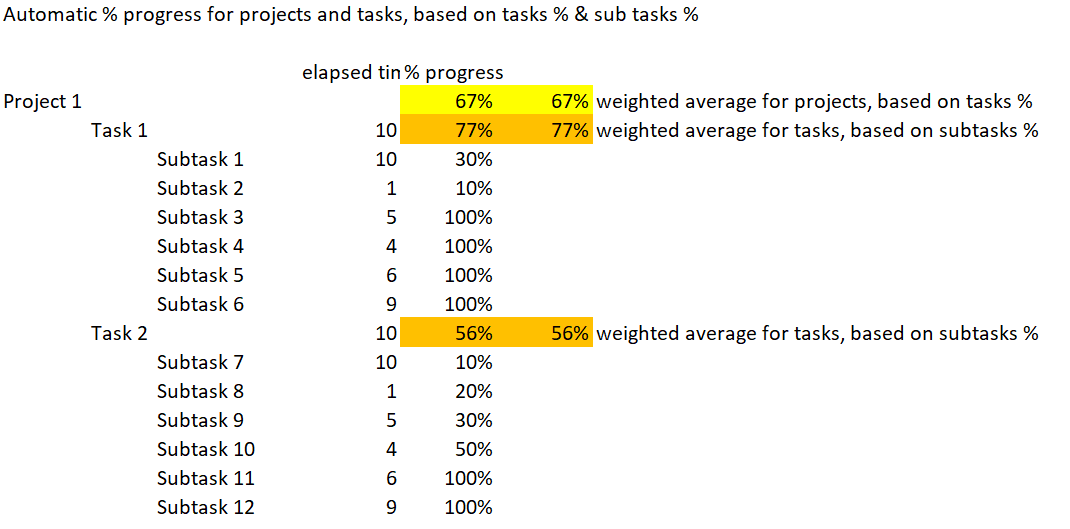 It would be nice to have an automatic KPI showing % progress on projects, based on tasks, and on tasks, based on subtasks: