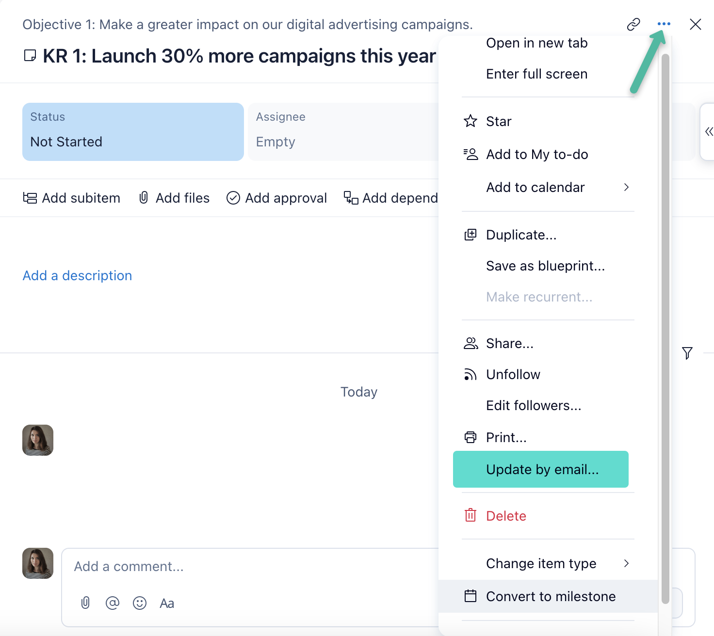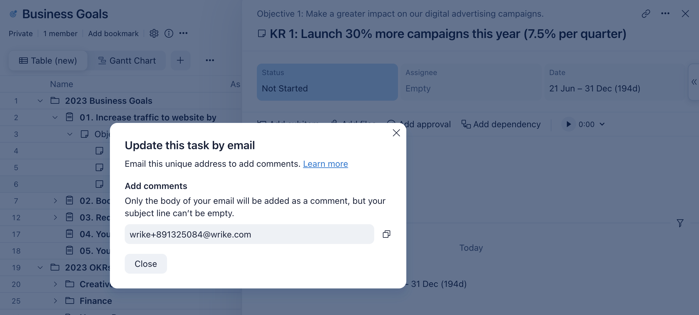 Do I understand correctly that you mean email updates for items in Wrike? In that case, you can click on the three-dot menu and choose the option to 'Update by email...':