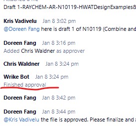 When printing a task that includes an approval decision, there is no evidence of the decision in the printed version. Wrike bot displays 'Finished approval' for both rejected and approved outcomes but does not include the decision. See below snip. Our team files approvals occurring in Wrike for auditable project documents. In order for any sort of approval evidence to be documented in the printed version, the approver needs to type out the word 'approved' as a comment or within their approval decision which eliminates the convenience of the approval buttons.
