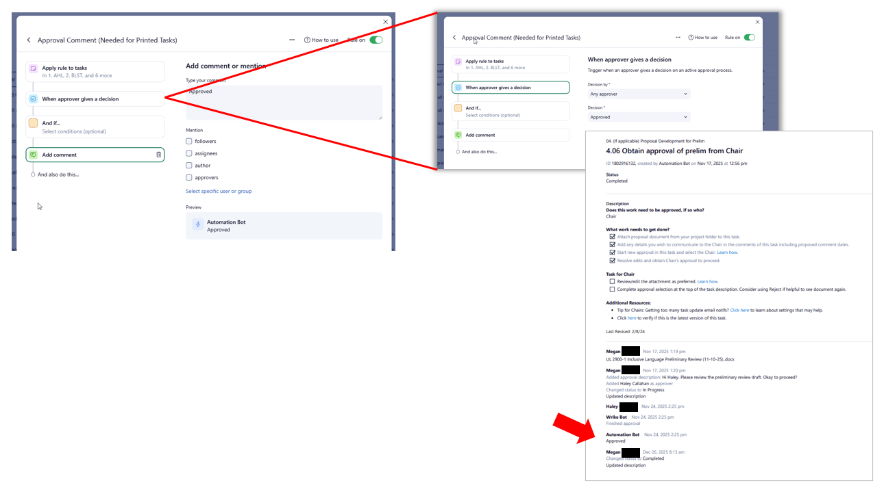 Steve's idea inspired the automation needed to help with our use case. Instead of creating an 'Approved' status label to automatically change to, I configured two rules to post a comment "Approved" or "Rejected" based on the approval decision trigger. The Wrike Bot comment shows when printed.