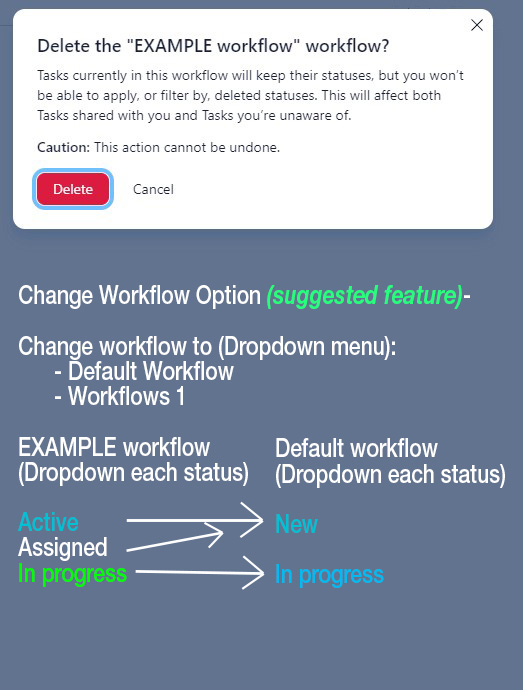 I would love to see a feature where you can easy exchange a custom workflow to new custom workflow in all the workflow steps when it's about to be delete or exchange with another workflow to change the workload pace. Once the feature is launch, I hope it would bring a notification window to give a warn if necessary to change or not. 😊