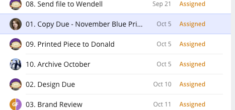 As you can see, it is messy and jumbled. How can I put #1 under #10 short of changing dates, which I cannot as the dates are firm. The due dates for these are the same for #10 and #1, but belongs to the new set of tasks. This is for a newsletter that goes out every month. If anyone can give me tips on how to get these in line, I'd appreciate it. Thanks!