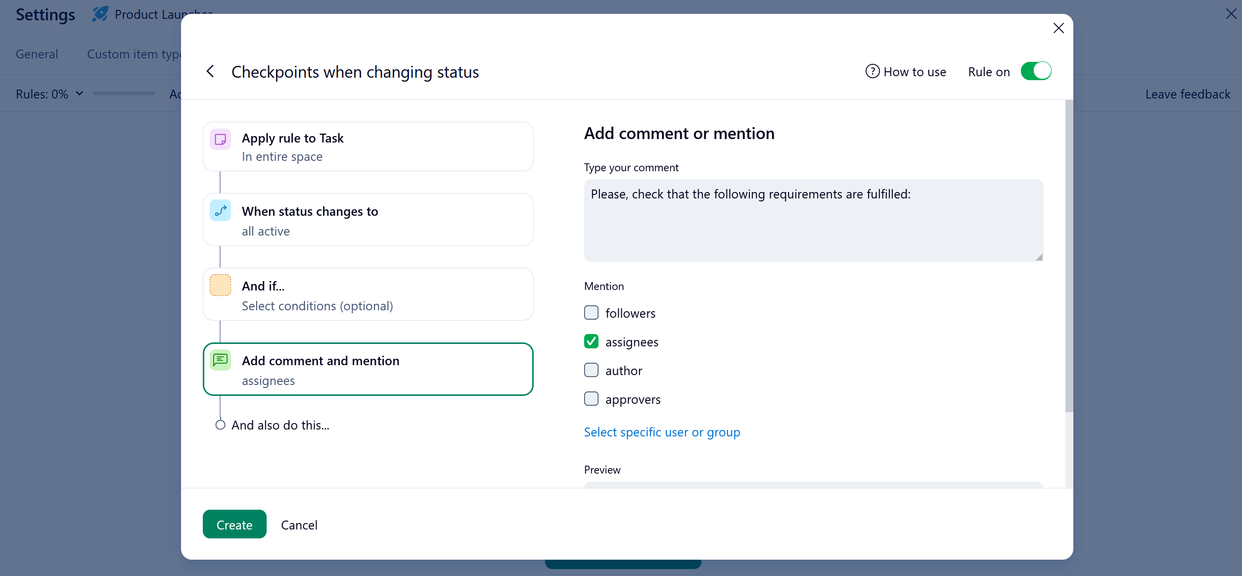 Hi Michelle Maginnis, welcome to the Community! Thank you for supporting this idea. May I ask if an automation rule could be helpful for you? You could create a rule that would trigger a comment and ask the assignees to check that all the requirements are fulfilled when the status is changed:
