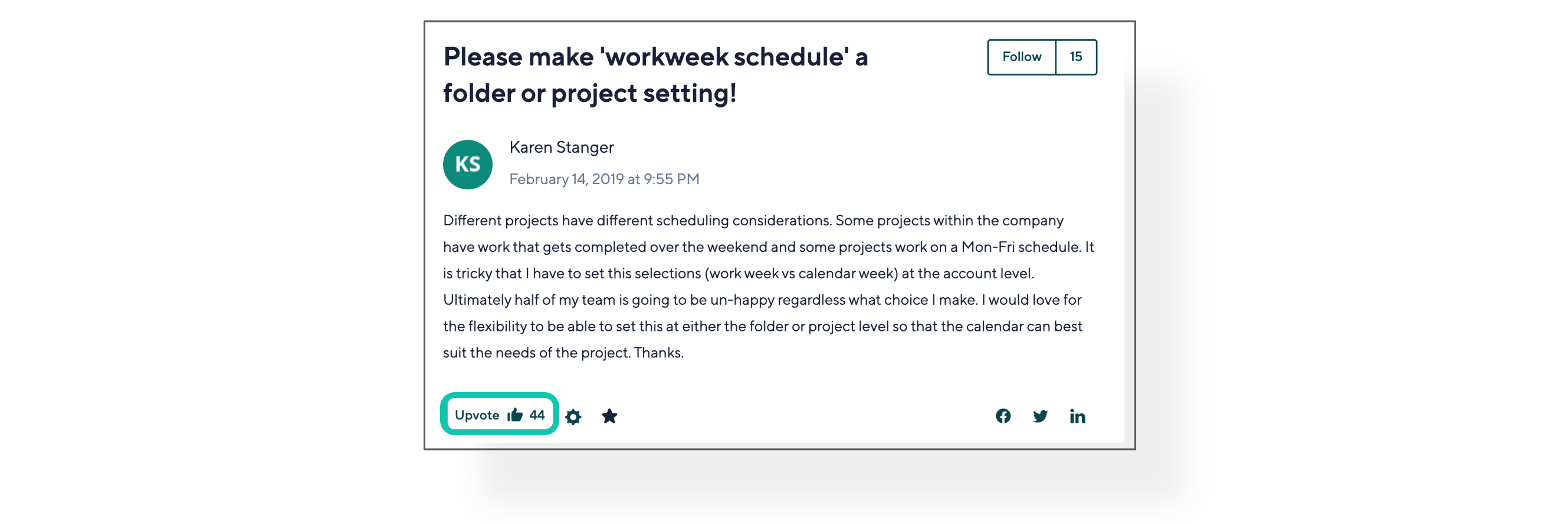 Please make 'workweek schedule' a folder or project setting!