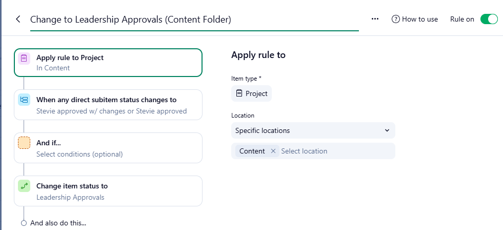 In my case, when ANY subitem of a project changes to "CUSTOM WORKFLOW STATUS", the project status should update to "CUSTOM WORKFLOW STATUS" - the two workflow statuses are different. Any ideas from the group as to why this isn't working? Theoretically, I could do this for all of our major stage gates to keep the high level view updated.