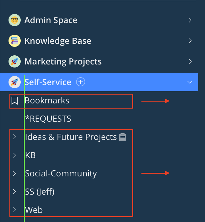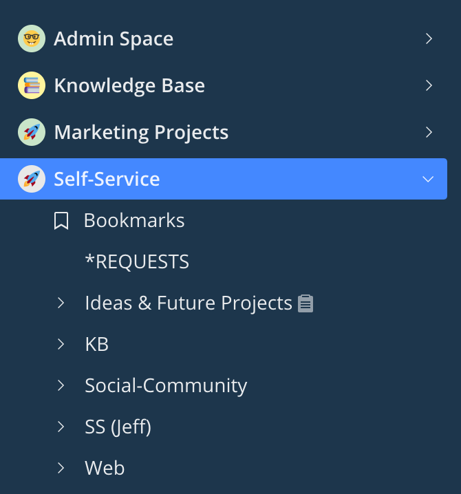 What would make the left side nav much more better is if "Bookmarks" and its icon and also "> Folder" were indented for each Space. Right now, it does not visually look like Bookmarks is a part of its parent space - it looks instead like they share the same hierarchical level.