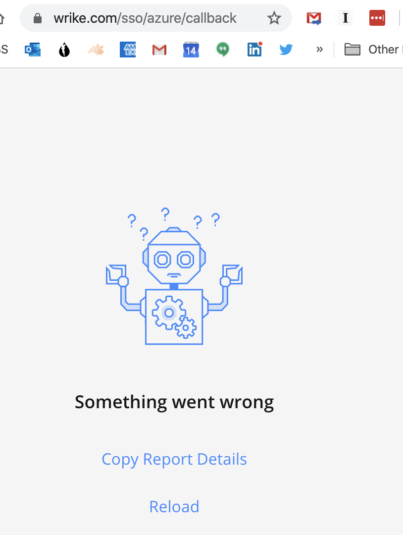 To reproduce the scenario, add the Wrike plug-in to a Team using Teams on the web.  You will authenticate and give permissions using the regular 365 workflow.  This works fine.  Then open the Teams thick client and click your new Wrike tab.  You will be prompted to login.  The login flow kicks the authentication to a webpage, and you get the Something Went Wrong page.  I pasted in the full report below the screenshot below.